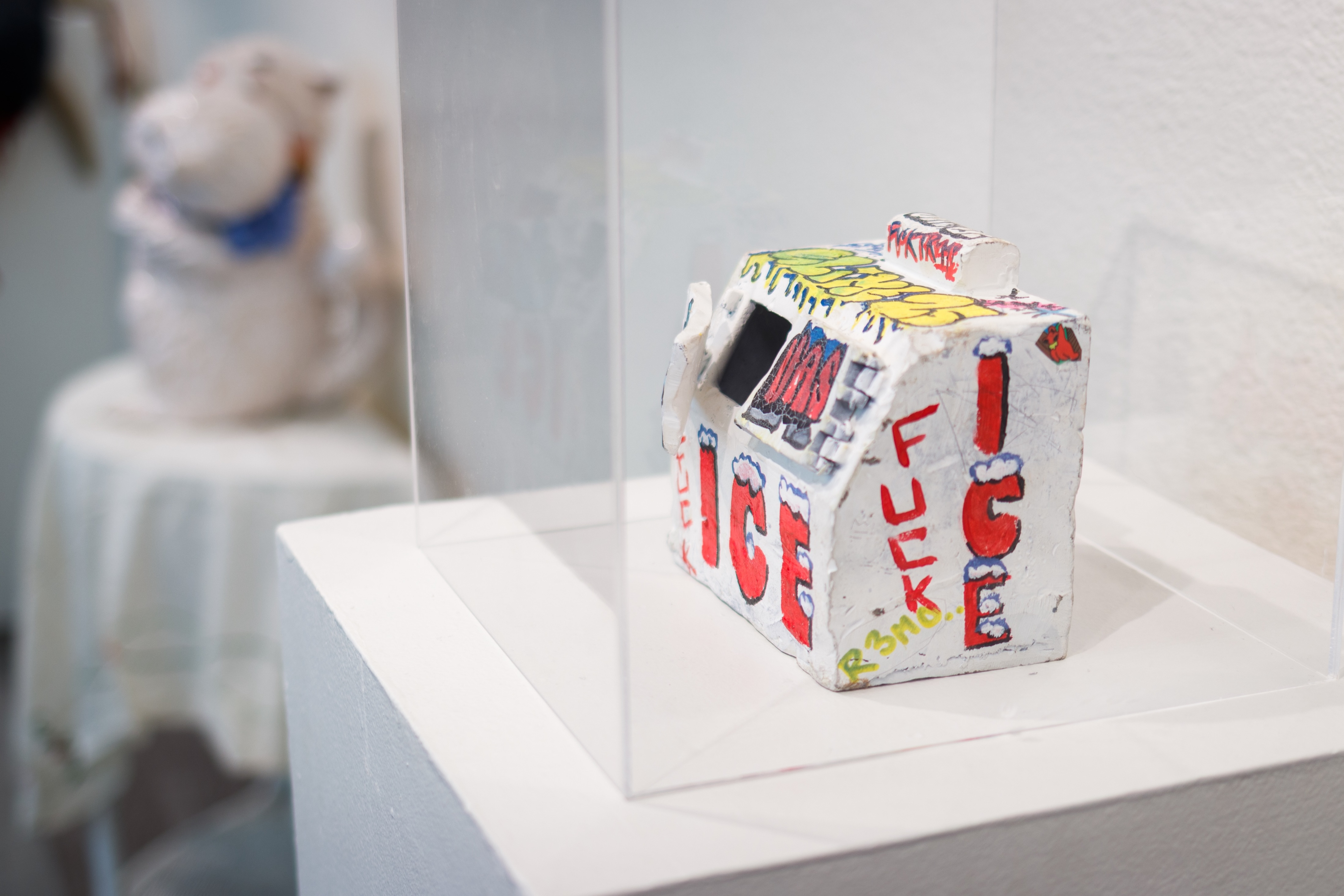I’m proud of our use of alternative kinds of pedestals. We pivoted a lot on the day of installation, unable to leave until we felt like the space represented us as closely as possible. Whether we used metal scrap, stacked traditional pedestals, or accompanied the work with an environment of decay, all of these decisions happened spontaneously and are still the most impactful choices we felt that we made.