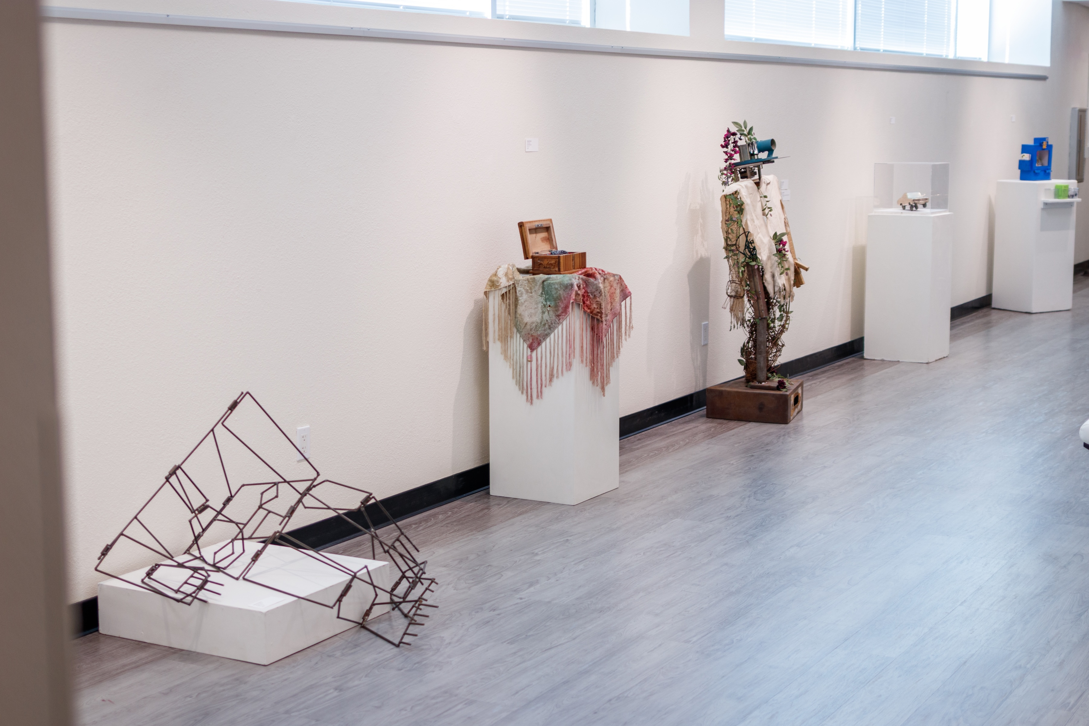Because there were many different kinds of artwork, and the gallery space was so long, we decided to spread the work around the room based on things like size, color, and medium. Our goals included keeping pops of color throughout the room and balancing the height of pedestals with the width of artwork, as well as considering the ability of the viewer to move closer to and up to the pieces. Not only did we create dynamic pieces for exhibit, but we wanted the space to be engaging and unconventional too.